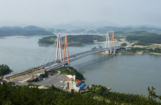 진도대교는 우리나라 최초의 사장교(斜張橋)다. 해남 문내면 학동리에 머리를 두고 진도군 군내면 녹진리에 두발을 뻗고 있다. 진도대교에 올라 울돌목을 내려다 보면 바다는 흰거품을 일으키며 소용돌이 친다. 전망대에 오르면 진도대교, 명량해협, 우수영 전경과 명량대첩공원, 그리고 올망졸망한 섬들의 기나긴 행진을 볼 수 있다.