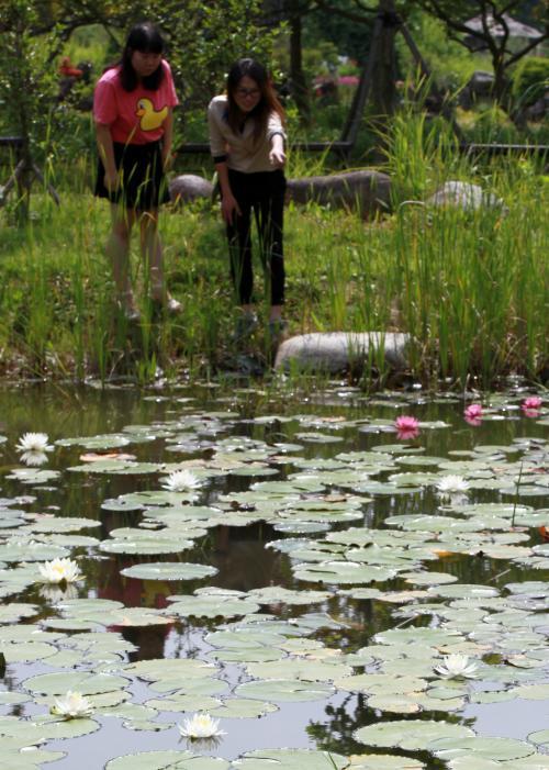 10일 함평군 대동면 함평 자연생태공원내 연못에 만개한 수련이 청초한 자태를 뽐내고 있다. 수련 꽃잎은 낮에 활짝 벌어졌다가 밤에 접힌다.