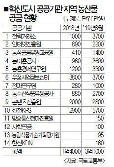 이같은 내용은 국토교통부가 지난 연말 발표한 ‘혁신도시 상생협력 우수사례’ 책자에 담겼다. 자료에 따르면 지난해 1~8월 혁신도시 14개 공공기관에 공급된 지역 농산물 매출액은 3억1100만원으로 집계됐다. 이는 지난 2018년 매출액(1억4500만원) 보다 113.4%(1억6500만원) 증가한 수치다.