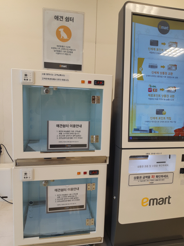 이곳에는 반려동물 전용 패드와 온도조절 기능이 갖춰져 있다. 이마트 관계자는 “반려동물을 데리고 온 고객의 불편을 줄이고 쾌적한 쇼핑 환경을 조성하기 위해 애견 쉼터를 잇따라 조성하고 있다”며 “반려동물 때문에 매장 오기를 망설이던 고객을 유입하는 효과를 기대하고 있다”고 말했다.