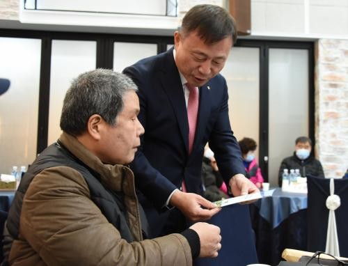 농협 광주지역본부(본부장 강형구·오른쪽)는 5일 광산구 우산동 광주무역회관에서 개최된 ‘송정농협 제47기 정기총회’에서 조합원들에게 ‘2020년 농어업인 연금보험료 지원 제도’를 홍보했다.<농협 광주본부 제공>