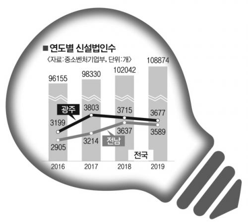지난해 전국 신설법인 수는 역대 최다를 기록했지만 광주·전남 법인 수는 오히려 감소했다. 창업을 위한 인프라와 지원책이 수도권에 몰린 탓에 지역 창업 여건은 더욱 악화되고 있다는 지적이다.