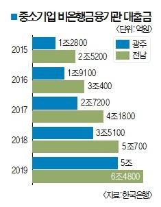 특히 광주 중소기업의 비금융권 대출 증가율은 42.5%(1조4919억)로 전국 평균 증가율 28.8%의 2배를 훌쩍 넘었다. 지역별로 보면 대전(45.5%), 대구(42.5)에 이어 세 번째로 높았다. 전남 증가율은 27.6%로 9번째로 높았다.