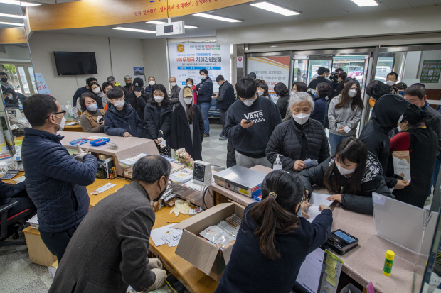 공적 마스크 판매 첫날인 지난 달 28일 전남지역 읍·면 우체국 220곳에서는 마스크가 10여 분 만에 동이 났다. 1곳당 공급된 물량은 350개(5개입 70세트)였다. 판매 첫날 ‘흑산가거도우체국’은 이날 기상여건이 악화돼 마스크가 공급되지 못했고, 오전 영업만 한 ‘강진 옴천우체국’은 주어진 물량의 절반을 판매했다.
