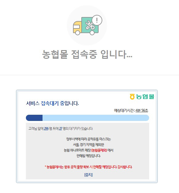 마스크 공적 판매처의 하나인 농협은 지난달 27일부터 전날까지 4일간 마스크 총 279만개를 공급했다. 농협 관계자는 “2일 오전 현재까지는 내일 공급 가능 마스크가 한 개도 확보되지 않았지만 최선을 다해 물량 확보에 나서고 있다”며 “광주지역 물류센터에서는 운반 차량이 부족해 농협 직원이 직접 자신의 차로 마스크를 나르고 있다”고 말했다.
