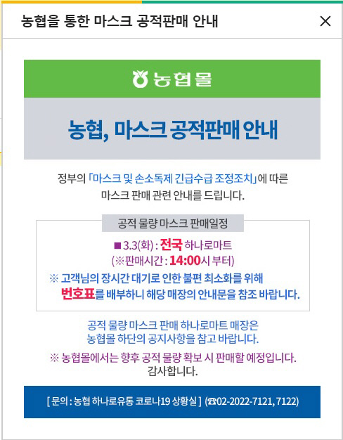 농협 측은 “마스크 수요 확대로 인한 구매 고객 줄서기와 대기시간 증가 등 불편 사항을 최소화하기 위해 영업점별 번호표 배부, 잔여물량 공지 등 다양한 조치를 시행해 나갈 계획”이라고 말했다.