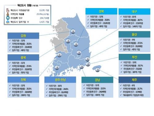 지난해 말까지 나주 혁신도시에는 278개의 민간기업이 입주했다. 정부는 혁신도시 입주기업에 사무실 임대료, 부지분양대금, 건축비 이자 등을 지원하고 있다.