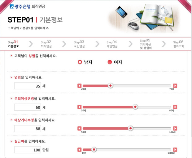 이곳에서는 은퇴자산 설계에 대한 도움을 받고 퇴직연금 상품 등에 대한 정보를 얻을 수 있다. 최근에는 ‘모바일 학습과정’이 신설돼 확정급여형(DB), 확정기여형(DC), 개인형퇴직연금(IRP) 등 법정교육을 스마트폰을 통해 받을 수 있게 됐다. 은퇴 뒤 받을 연금이 궁금하면 광주은행 ‘퇴직연금 시뮬레이션’을 이용하면 된다. 성별과 나이, 은퇴예상연령, 예상기대수명, 월급여 등 기본정보를 입력하면 은퇴 때 받을 퇴직연금, 국민연금, 개인연금 등 5단계에 걸쳐 연금정보를 얻을 수 있다.