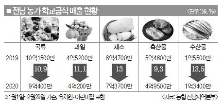 9일 농협 전남지역본부에 따르면 올해 1월1일~2월29일 전남 농가의 학교급식 매출은 37억1300만원으로 나타났다. 이는 지난해 같은 기간 매출 40억9300만원 보다 3억800만원(-9.3%) 떨어진 금액이다.