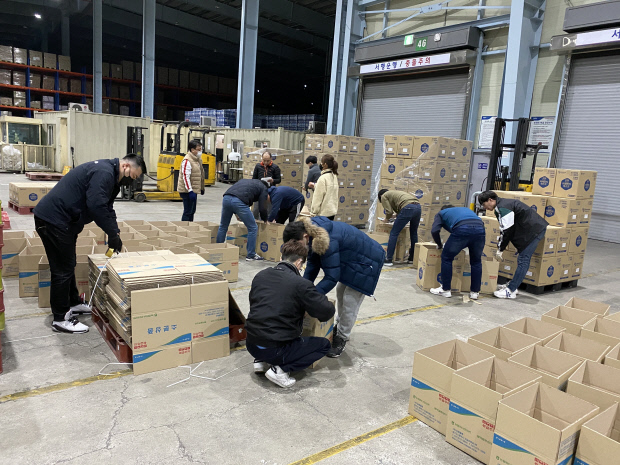체감온도는 영하를 가리켰지만 60여 명의 인력은 구슬땀을 흘리며 다음 날 공급할 마스크를 점포별로 나누고 있었다.