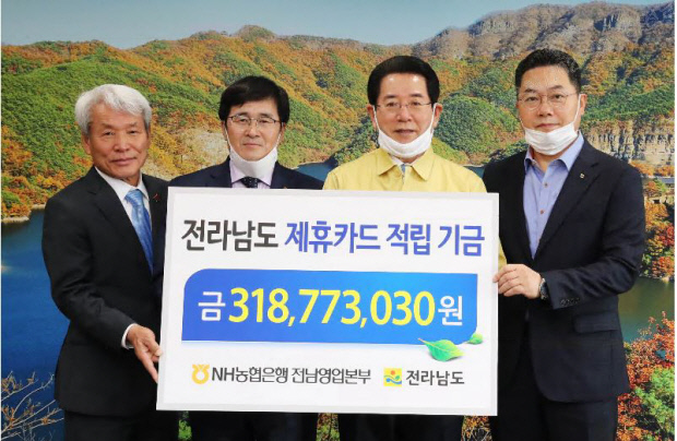 NH농협은행 전남영업본부는 최근 전남도청에서 ‘전남도 제휴카드 적립기금’ 3억1900만원을 전남도에 전달했다고 16일 밝혔다.