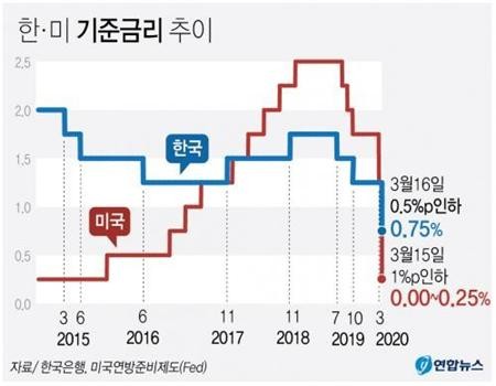 코로나19로 침체된 경기를 살리기 위해 한국은행이 16일 기준금리를 연 1.25%에서 0.75%로 0.50%포인트 전격 인하했다. 앞서 15일(현지시간) 미국 연방준비제도(Fed·연준)가 ‘0%대’로 기준금리를 내린 뒤 국내 기준금리도 사상 첫 ‘제로금리’ 시대를 맞게 됐다.