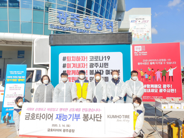 또 14일에는 금호타이어 대표적 봉사단체 ‘재능기부 봉사단’이 광주시자원봉사센터 직원들과 함께 광주송정역을 방역하고, 이용객들에게 휴대용 손소독제를 배포했다.