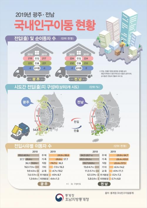 호남지방통계청이 16일 발표한 ‘2019년 국내인구이동 현황 및 분석’에 따르면 지난해 지역 순이동 인구는 광주 -3875명, 전남 -8788명으로 집계됐다.