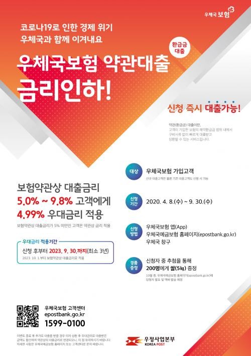 금리인하 신청기간은 오는 9월30일까지이며, 대출금리 인하 혜택은 2023년 9월30일까지(최소 3년) 적용받을 수 있다. 우체국보험 앱과 홈페이지, 우체국창구에서 신청할 수 있다.