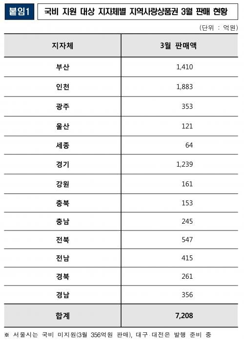 국비 지원을 받은 13개 시·도별로 비교하면 지난 달 판매액은 부산이 1410억원으로 가장 많았다. ▲인천 1883억 ▲경기 1239억 ▲전북 547억 ▲전남 415억 ▲경남 356억 ▲광주 353억 ▲경북 261억 ▲충남 245억 ▲강원 161억 ▲충북 153억 ▲울산 121억 ▲세종 64억 등이 뒤를 이었다. 서울은 국비를 지원받지 않고 있으며 3월 판매액은 356억원을 기록했다.