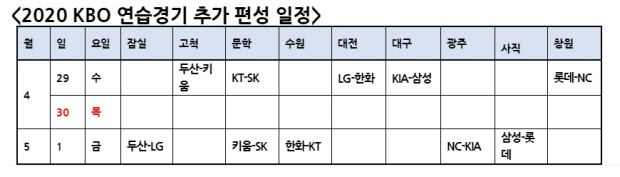 KBO는 23일 KBO 연습경기를 추가 편성해 발표했다. 팀당 2경기씩 총 10경기가 더 열리며 29일(수)과 5월 1일(금) 각각 5경기씩 진행된다.