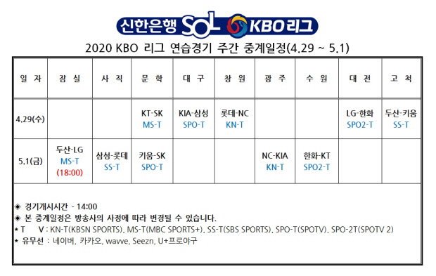 KBO가 25일 추가 편성된 연습경기 중계 일정을 확정했다.