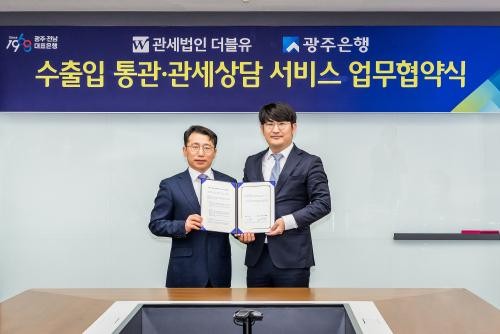 광주은행은 27일 동구 대인동 본점에서 관세법인 더블유와 ‘수출입 통관·관세 상담서비스 업무협약’을 체결했다고 이날 밝혔다.