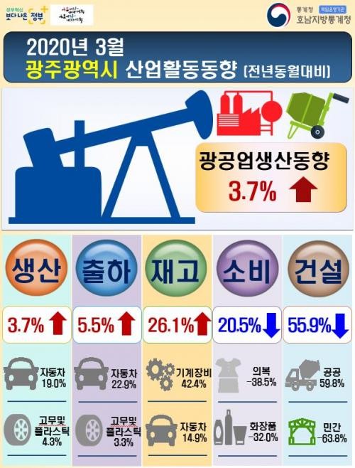 호남지방통계청이 29일 발표한 3월 광주·전남 산업활동 동향에 따르면 광공업생산액은 지난해 같은 기간에 비해 광주는 3.7% 올랐지만, 전남은 0.5% 줄었다.