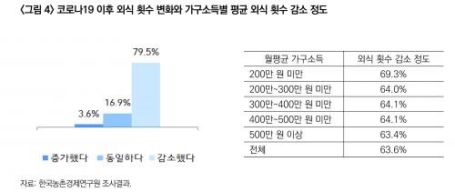 한국농촌경제연구원이 지난달 25일부터 27일까지 전국 시·도민 1011명을 대상으로 유무선 전화를 활용해 ‘코로나 19 이후 농업·농촌에 대한 도시민의 인식과 수요 변화’ 설문 조사를 한 결과에 따르면 79.5%는 코로나 19 이후 석 달(2~4월) 동안 외식 횟수가 감소했다고 답했다.
