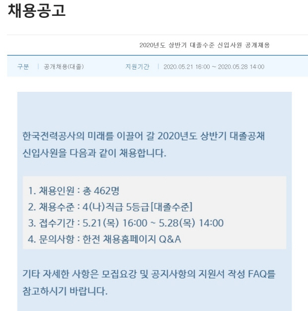 한전은 이날 462명 규모 대졸공채 일정을 공지했다. 지원 기간은 오는 21~28일로 채용 홈페이지에서 온라인 접수한다.