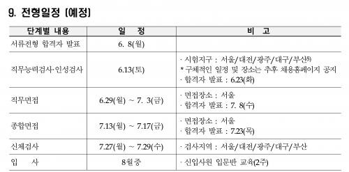 서류전형 합격자는 오는 6월8일에 발표하며 같은 달 13일 광주·서울·대전·대구·부산에서 직무능력검사·인성검사를 치른다. 직무면접·종합면접·신체검사 등을 거쳐 최종 선발된 신입사원은 8월에 입사하게 된다.
