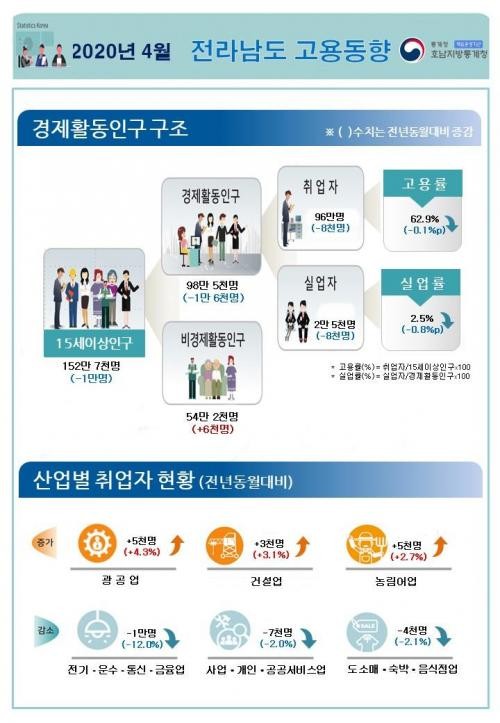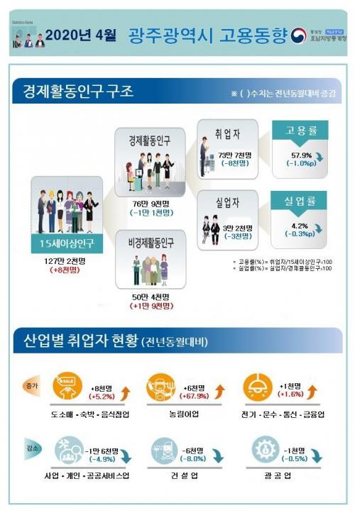 호남지방통계청이 13일 발표한 ‘2020년 4월 고용동향’에 따르면 지난 달 지역 고용률은 광주 57.9%·전남 62.9%로 집계됐다.
