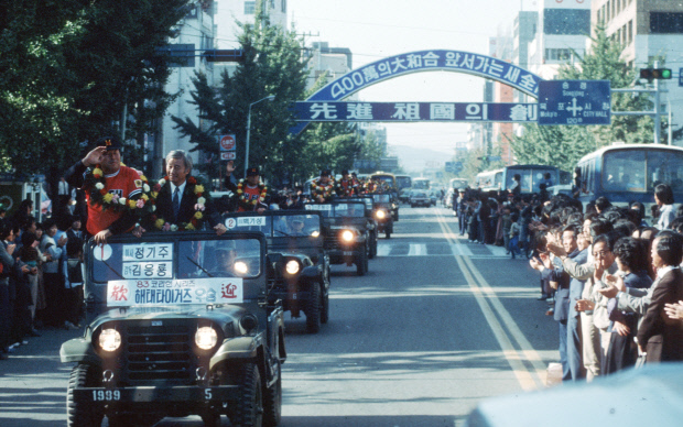| 1987년 삼성과의 한국시리즈에서 우승을 차지한 뒤 우승 트로피를 끌고 있는 모습. |