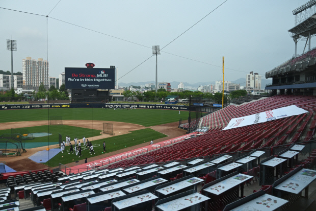 KIA가 16일 ESPN 생중계에 맞춰 챔피언스필드 1루 관중석에 ‘Be Strong MLB! We’re in this together’ 문구가 담긴 대형 현수막을 걸었다. KIA는 경기 도중 전광판으로도 응원 메시지를 띄울 예정이다.
