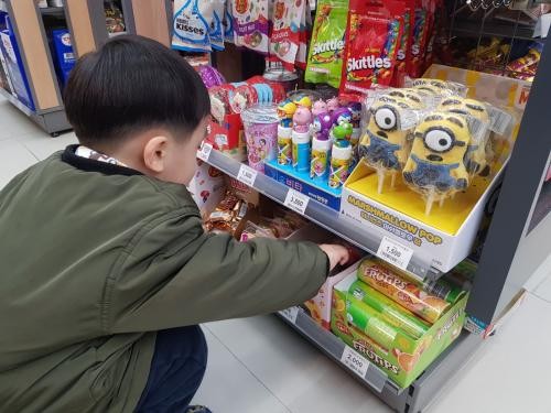 재난지원금을 사용하기 시작한 지난 13일부터 17일까지 광주·전남지역 222개 이마트24 점포의 식품 매출이 전주 같은 기간보다 15.8% 증가한 것으로 나타났다. 어린이가 완구용품을 고르는 모습. <이마트24 제공>