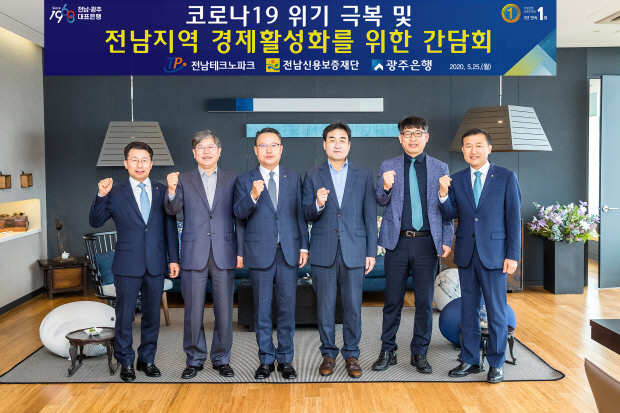 광주은행(은행장 송종욱·왼쪽 세번째)과 전남테크노파크(원장 유동국·두번째), 전남신용보증재단(이사장 정양수·네번째)은 25일 ‘코로나19 위기극복 및 전남 경제활성화를 위한 간담회’를 열고 지역 중소기업에 대한 시설·운전자금 지원방안 등을 논의했다. <광주은행 제공>
