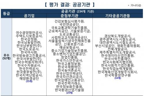 공기업인 한국전력공사와 준정부기관인 사립학교교직원연금공단, 한국농어촌공사, 한국전력거래소 등 4곳은 우수 평가를 받은 52곳 안에 들었다.