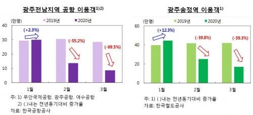 광주송정역에서 승하차한 이용객 수는 2월 25만1000명·3월 17만1000명으로 각각 지난해 같은 달에 비해 39.8%, 59.3% 급감했다. 무안국제공항, 광주공항, 여수공항 이용객 역시 2월 55.2%, 3월 69.5% 감소했다.