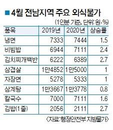 코로나19 여파로 광주·전남지역을 포함한 대다수 지역의 음식점 매출이 곤두박질친 가운데 전남지역 8개 주요 외식물가는 모두 올랐다.