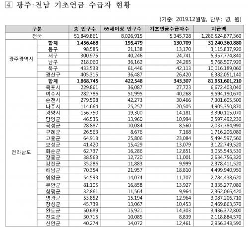 전남에서는 65세 이상 42만2548명의 81.2% 정도인 34만3307명이 기초연금을 받았다.