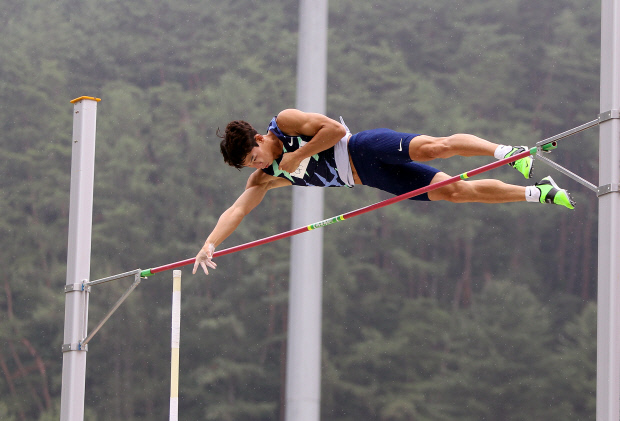| 진민섭이 27일 강원 정선종합운동장에서 열린 전국육상선수권 남자 일반부 장대높이뛰기 결선에서 5m40을 가볍게 넘고 있다. /연합뉴스 |