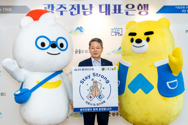 이춘우 광주은행 부행장이 지난 3일 동구 대인동 본점에서 코로나19 극복을 응원하는 ‘스테이 스트롱’(Stay Strong) 캠페인에 동참했다. 이 부행장은 김철신 전남개발공사 사장의 지목을 받은 뒤 이번 캠페인에서 정기섭 고운시티아이㈜ 회장을 다음 참여자로 지목했다. <광주은행 제공>