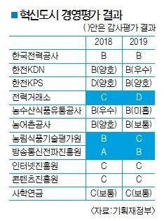 혁신도시 11개 기관 가운데 1년 전보다 평가가 낮아진 기관은 전력거래소(C→D)와 방송통신전파진흥원(A→B), 농림식품기술기획평가원(B→C) 등 3개 기관이었다.