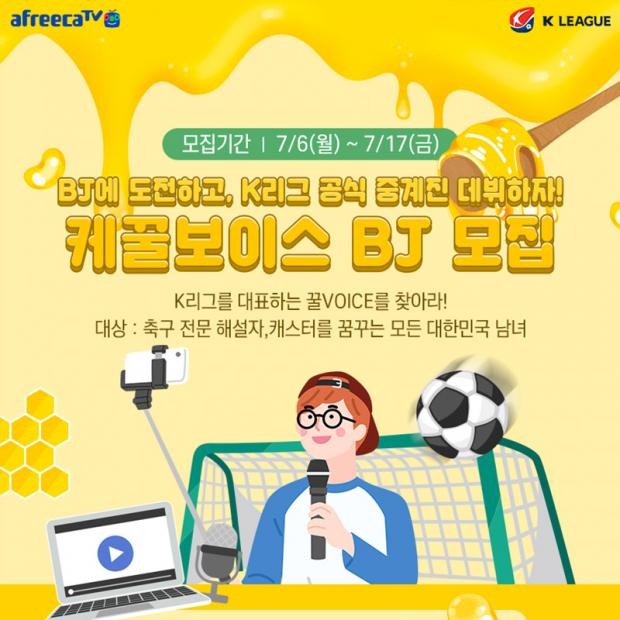 축구해설에 관심 있는 사람은 오는 17일까지 아프리카TV 홈페이지에서 ‘케꿀보이스’를 검색한 후 신청페이지를 통해 지원하면 된다. 축구 전문 해설자 또는 캐스터를 꿈꾸는 남녀 누구나 참가할 수 있다.