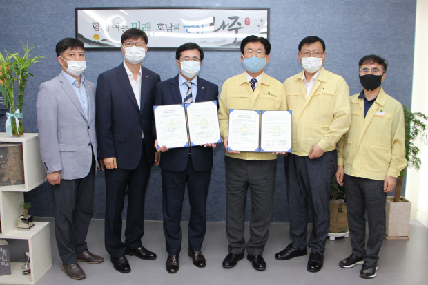NH농협은행 전남영업본부와 나주시는 16일 나주시청에서 업무협약을 맺고 ▲나주사랑카드 시스템개발 및 운영 ▲발행 및 이용 홍보 ▲판매 및 이용 서비스 제공 등 관련 업무 전반에서 유기적인 협력을 약속했다. 나주사랑카드는 지류화폐의 불편을 해소하기 위한 카드형 지역사랑상품권으로 나온다. 기존 지류 상품권의 단점인 부정유통 사전 방지는 물론 발행비용, 판매 및 환전 수수료 절감 등의 효과가 기대된다고 농협 측은 설명했다.