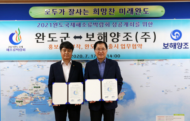 보해양조는 지난 17일 완도군청에서 신우철 완도군수, 오명호 보해 전남영업본부장 등이 참여한 가운데 업무협약을 맺고 박람회 홍보 방안 등을 논의했다.