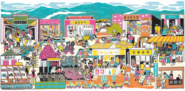 정승원의 ‘Swimming Pool’(2020)은 실내 수영장 풍경을 단순화시킨 실크스크린 판화다. 각자의 자세들로 수영을 즐기면서 풀장 한쪽에서 쉬거나 샤워하는 모습 등등 흔히 볼 수 있는 생활풍경이다. 일상의 소소한 행복과 즐거움, 사랑을 담은 마음의 치유 선물이 일러스트처럼 밝고 담백한 표현들에 담겨져 있다. ‘비키니 베를린’(2019)나 ‘양동시장’(2017) 등도 정승원 특유의 삶의 풍경 묘사들이다.