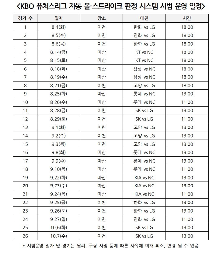 심판 판정의 정확성 향상과 공정성 강화를 위한 ‘로봇심판’ 운영 장비와 시스템은 퓨처스리그 구장 중 마산 야구장과 LG 이천 챔피언스 파크에 설치됐다.