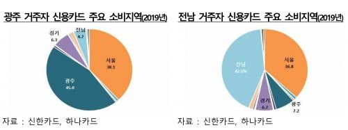 자신의 거주지에서 돈을 쓴 시도민 비중은 광주 45%·전남 42.5%이었다. 이외 최대 소비지는 서울로, 광주 38.1%·전남 36.8%가 본점 소재지를 서울에 둔 가게에서 돈을 썼다. 광주시민 4.7%는 전남에서, 전남도민 7.2%는 광주에서 소비했다.
