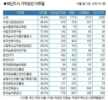 반면 전국 112개 혁신도시 이전 기관 가운데 가족동반 이주율 상위 30위권 안에 드는 기관은 우정사업정보센터(88.5%)와 농식품공무원교육원(74.6%), 국립전파연구원(71.4%) 등 3곳이었다.
