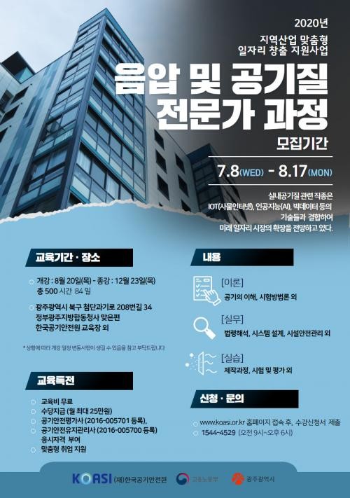 광주시 북구 오룡동에 있는 (재)한국공기안전원은 오는 17일까지 ‘음압 및 공기질 전문가 양성과정 2기’ 교육생을 모집한다고 11일 밝혔다.