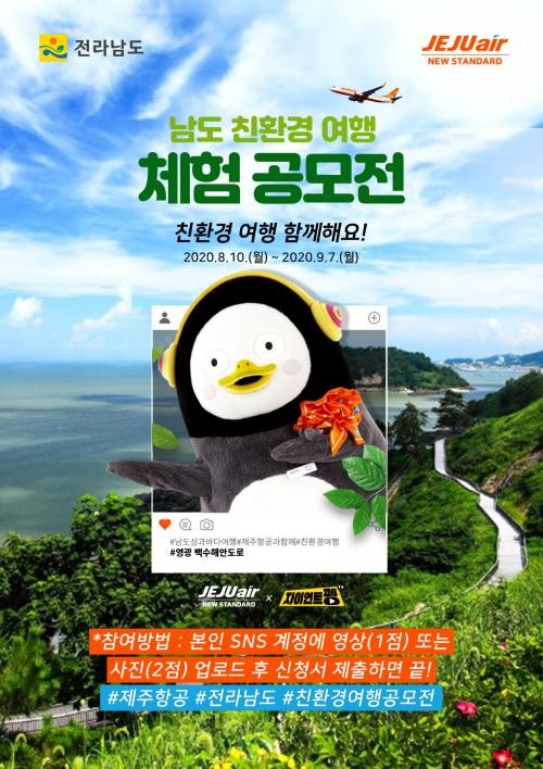 제주항공은 전남도와 오는 9월7일까지 소셜미디어를 통해 ‘남도 친환경 여행 체험 공모전’을 진행한다고 18일 밝혔다.