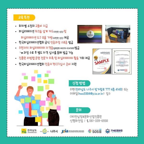 교육은 나주 혁신도시 일대에서 다음 달부터 11월까지 총 80시간 진행된다. 수강료는 전액 무료이며 회차별로 소정의 교통비와 중식비가 제공된다. 전문가 활동을 위한 퍼실리테이션 설계 카드와 도구 모음 가방도 주어진다.
