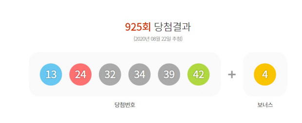 당첨 번호 '13, 24, 32, 34, 39, 42'
